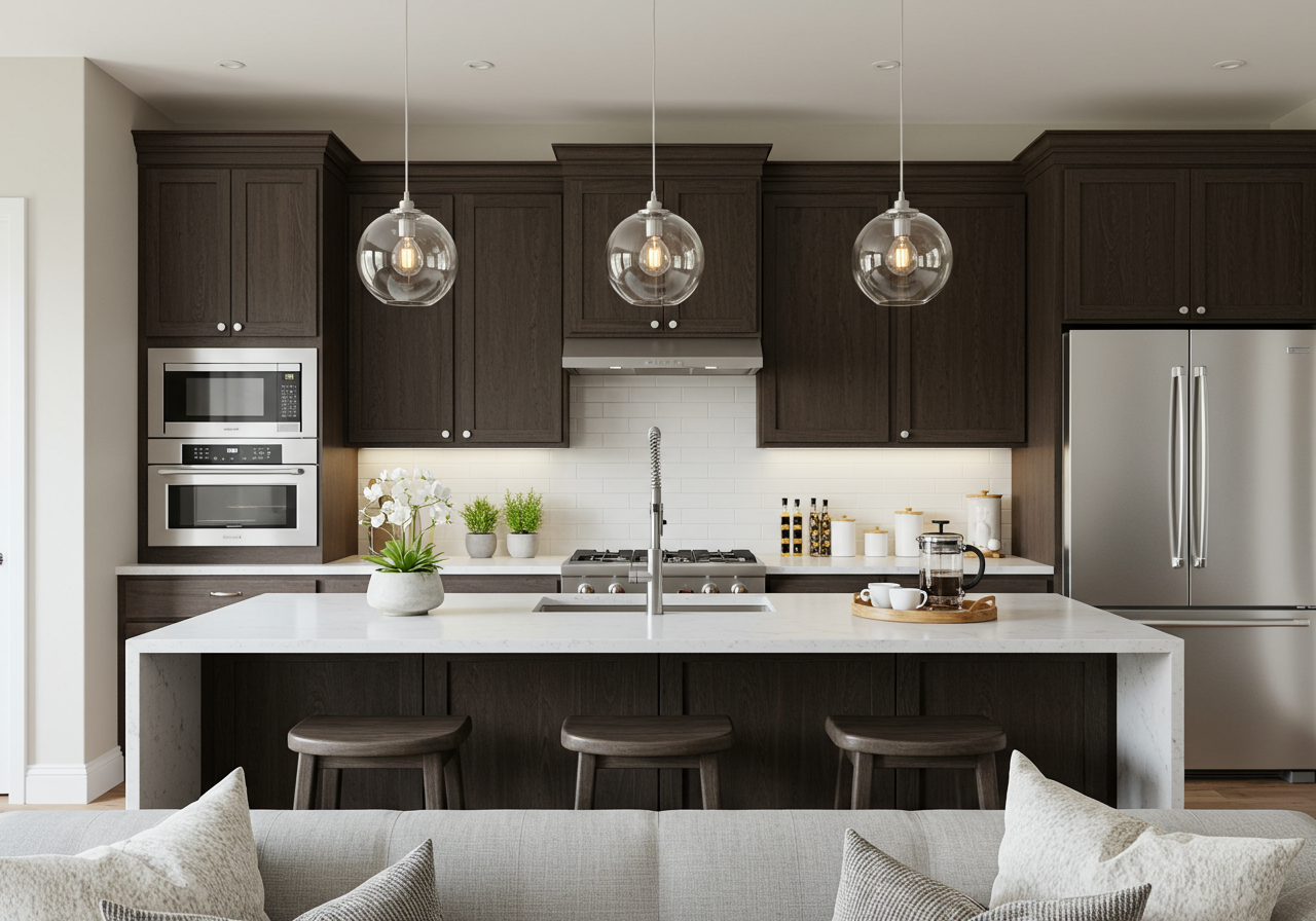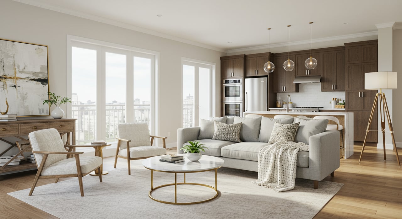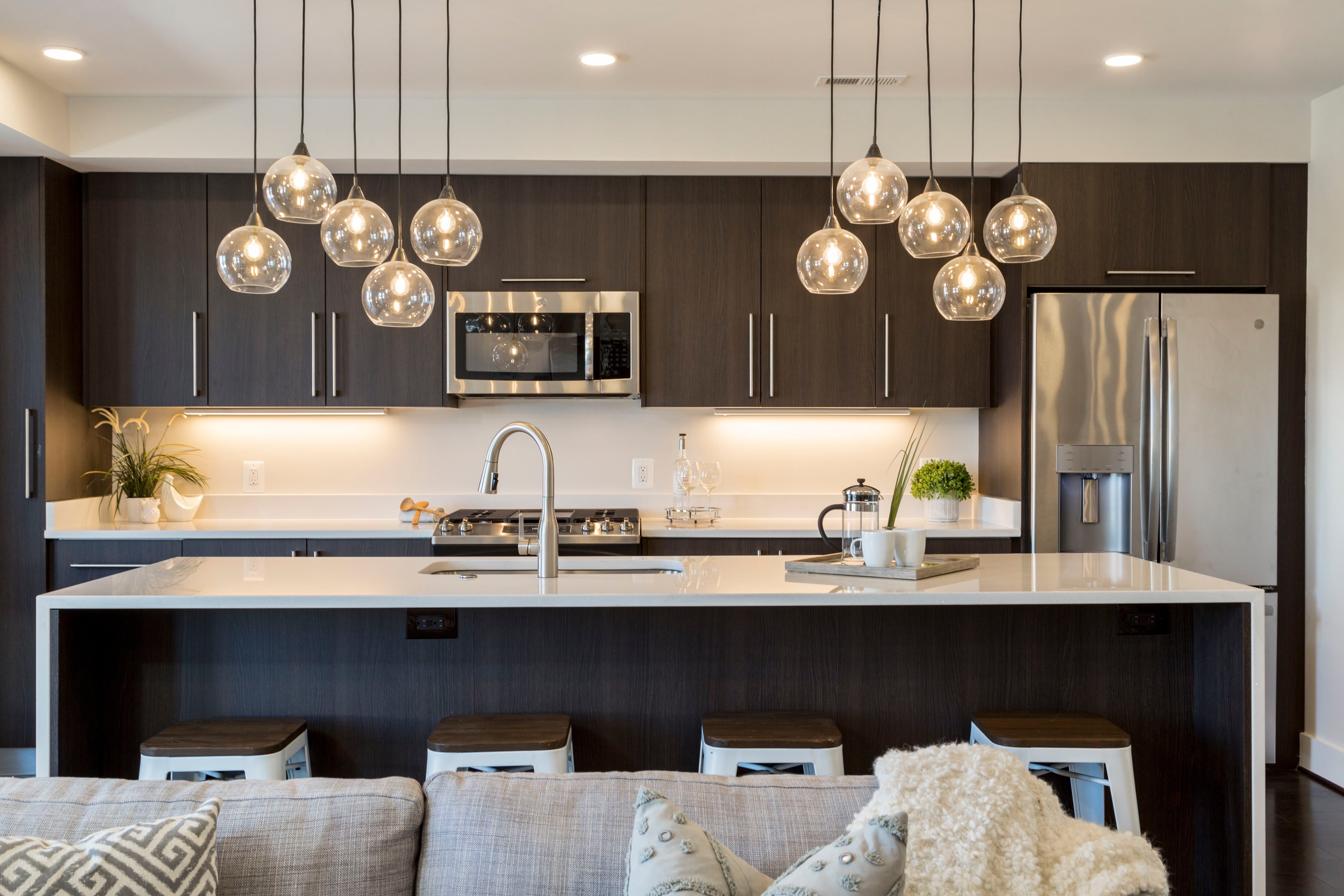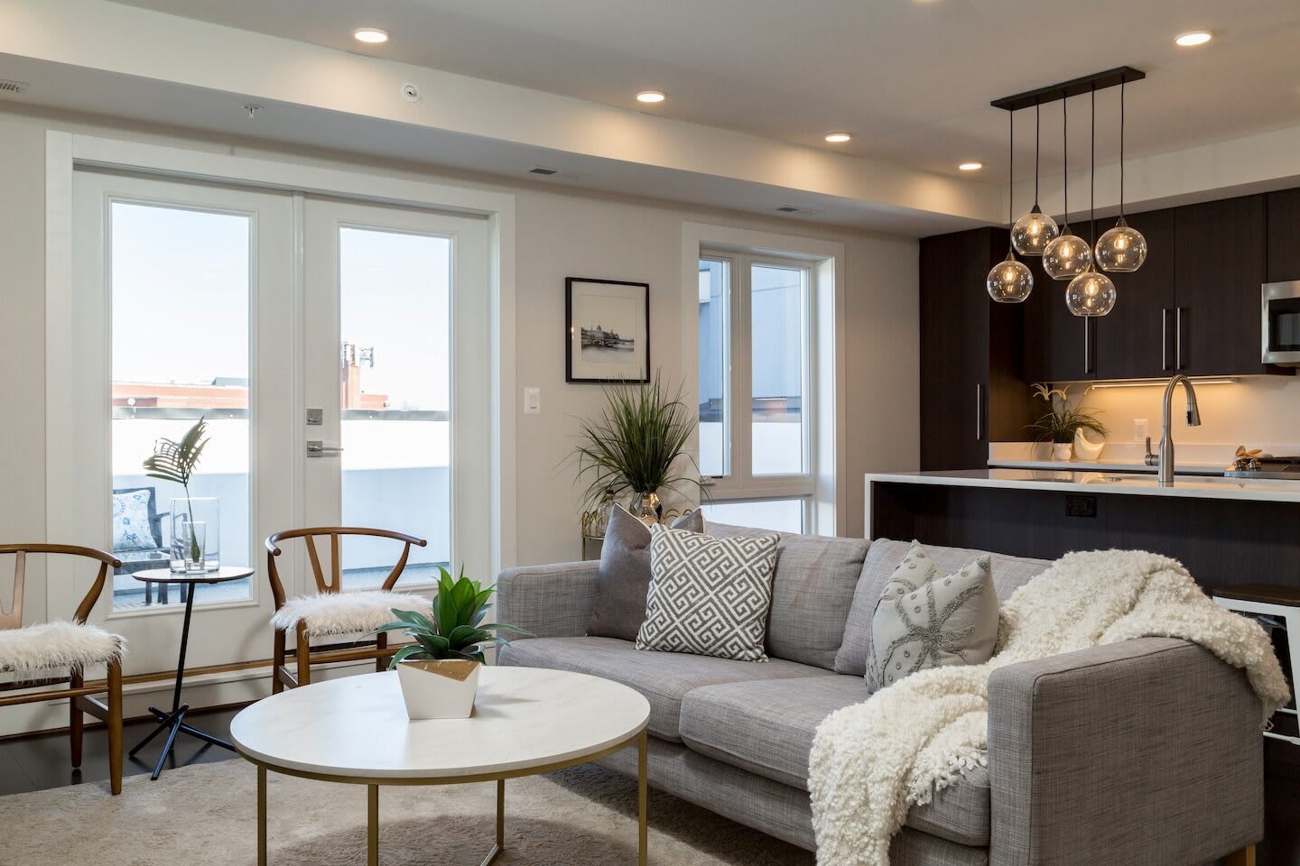 Model unit 103 is on two levels, with the open-plan living area and kitchen on the unit’s upper level. The living area is on one side of the kitchen island and the kitchen appliances are on the other. The back wall has a lot of window.