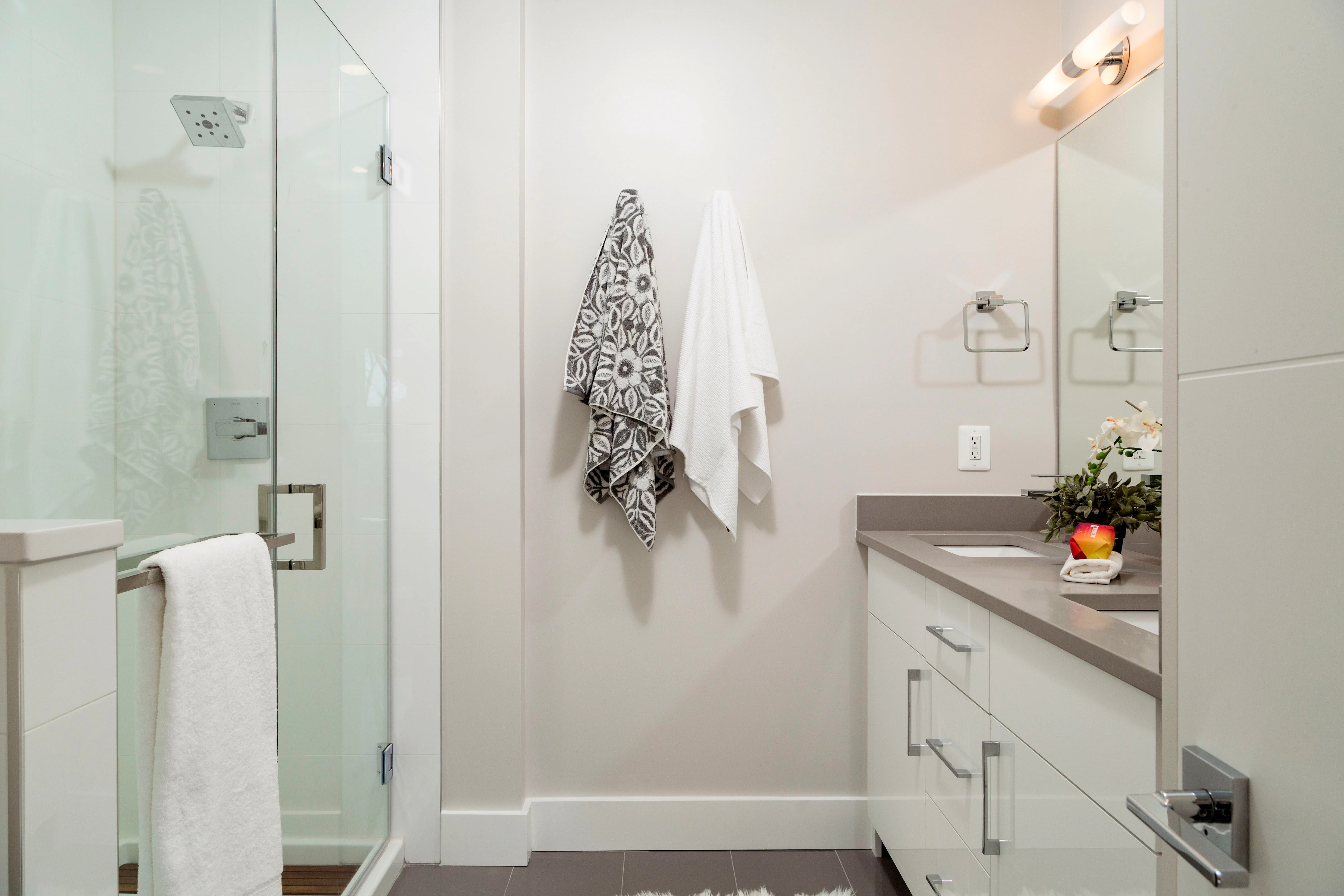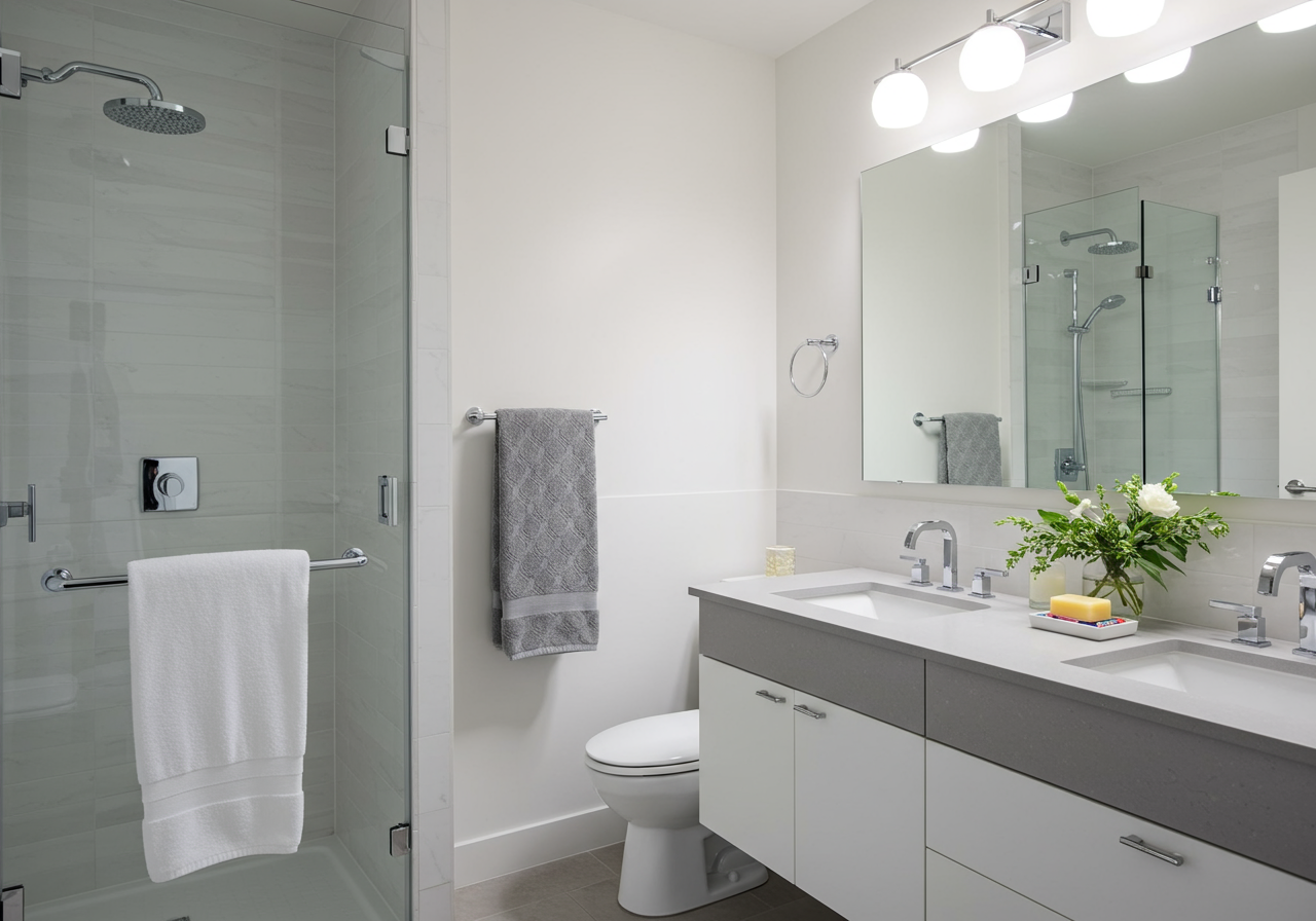 The master bathroom in penthouse unit 403 is shown. (Benjamin C Tankersley/For The Washington Post)