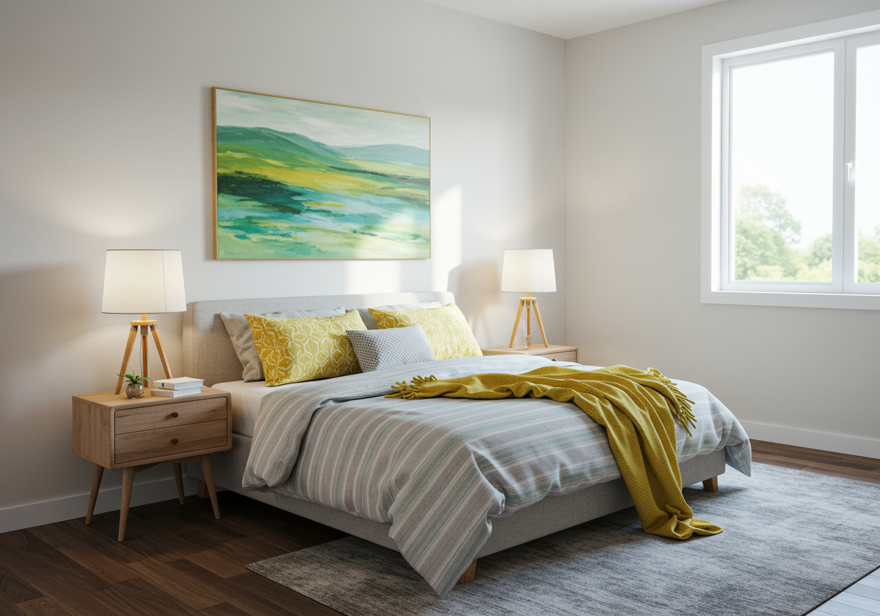 At the top of the stairs, there is a hallway with windows on one side. At the end of the hallway is the open-plan living area, with the kitchen and the living and dining rooms. On one side of the living area is a small hallway — with a powder room and a den — leading to the master bedroom and the en suite bathroom.