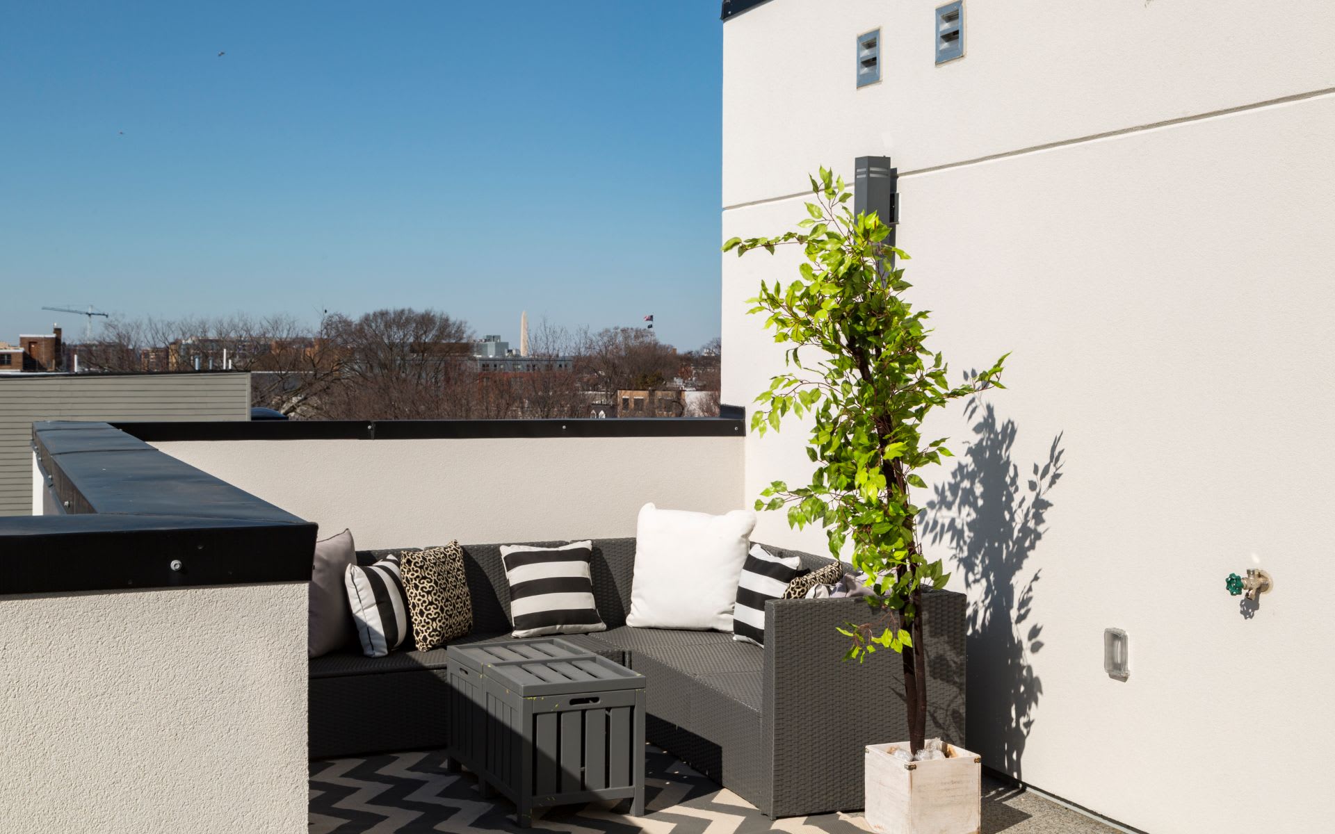 The penthouse, 403, has a lot of roof deck and offers views of the Capitol, the Washington Monument and the Anacostia River. The entrance to the penthouse unit is on its bottom level, along with a bedroom, a full bathroom, a closet and stairs to the main level above.
