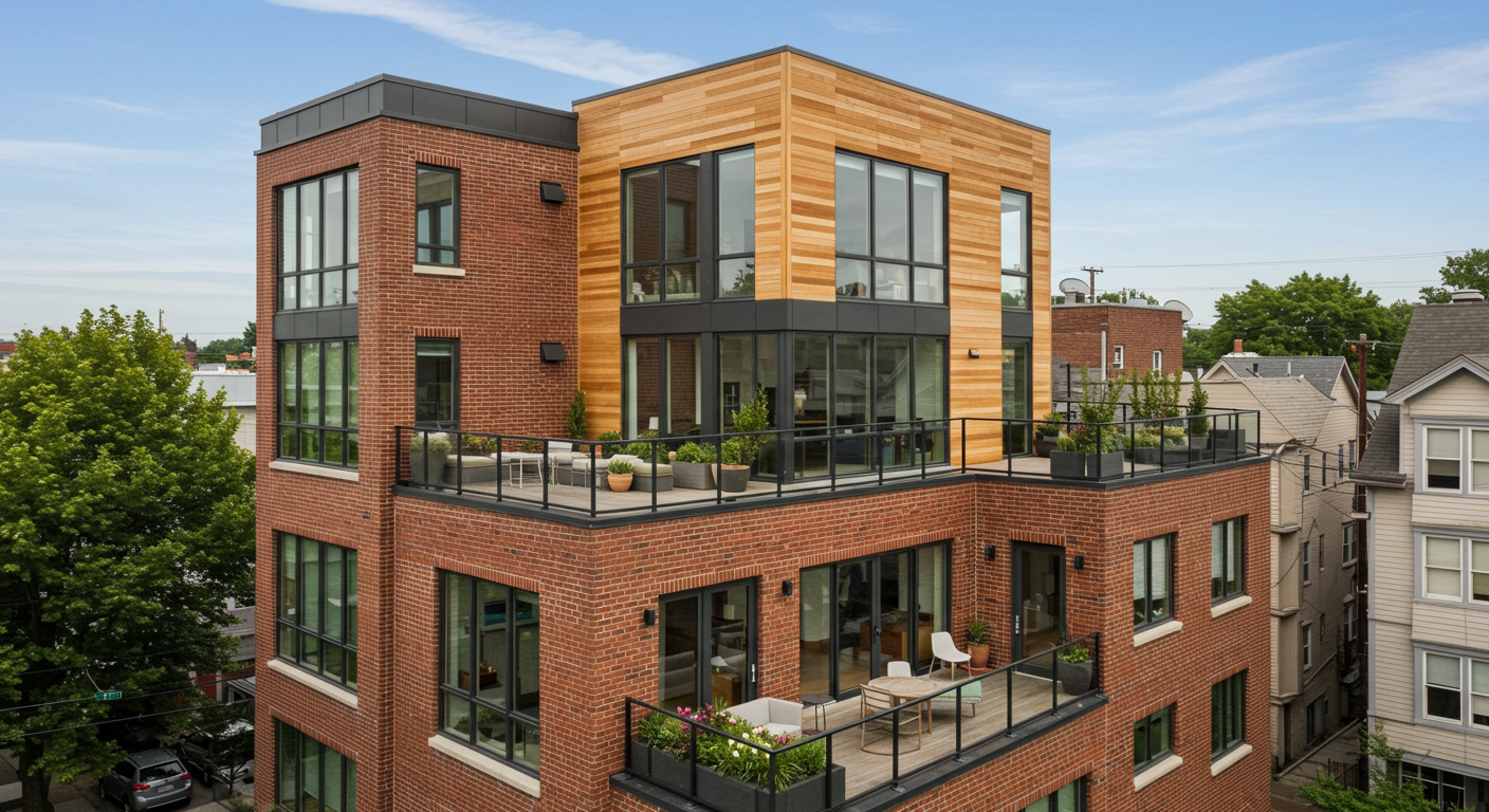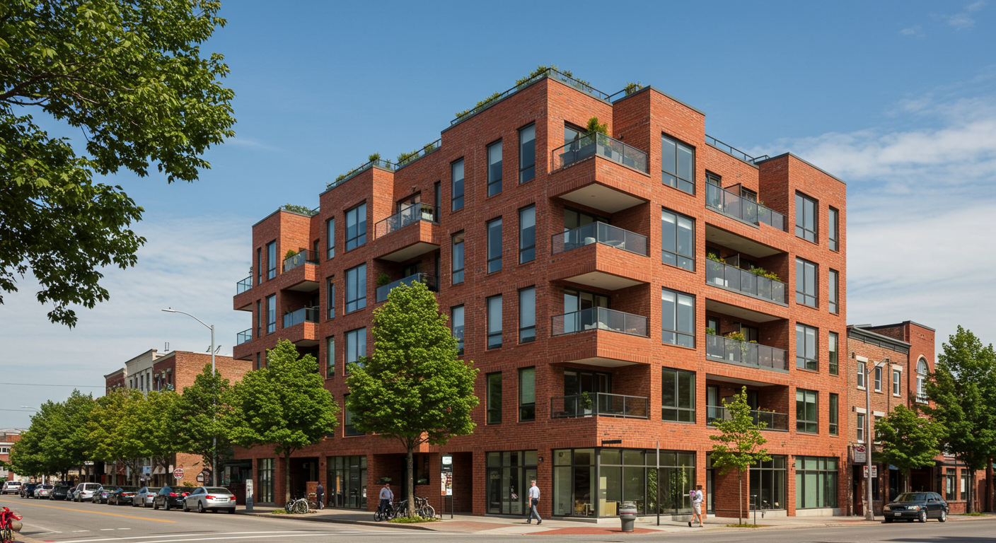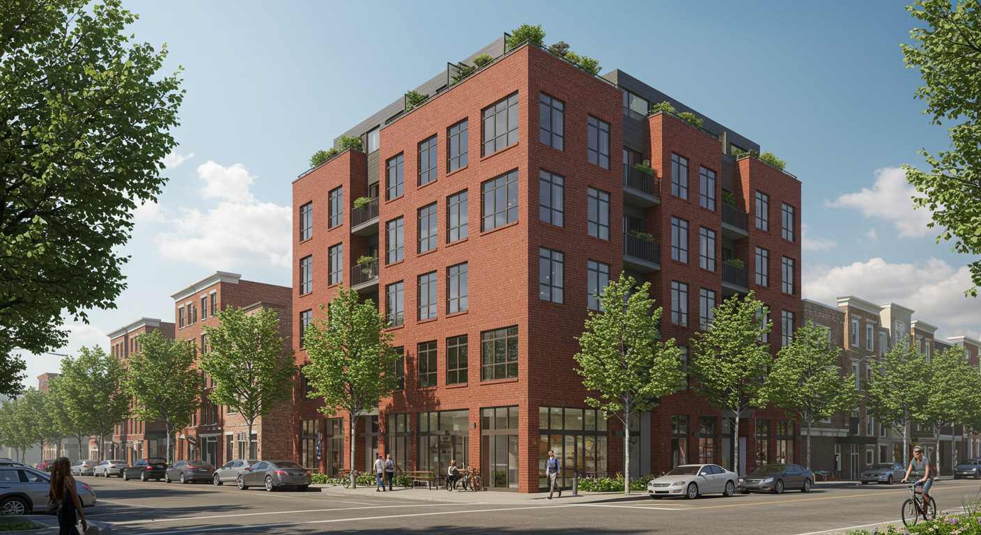 The red brick building has five stories above ground, plus a lower level. There are two units per floor from the lower level to the fourth floor. On each floor, one unit faces Upshur Street at the front of the building and one unit faces the rear. The fourth and fifth floors are set back from the street-level facade, creating outdoor space for the two-story penthouses on floors four and five.