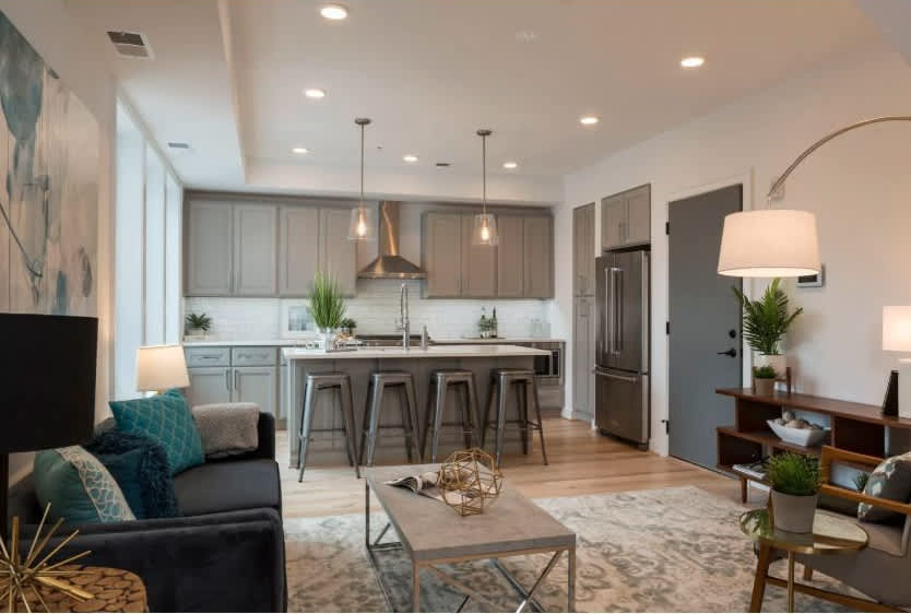 Islands for entertaining: The four units for sale — 4, 6, 8, 10 — have L-shaped open-concept living spaces. From the hallway, the entry to the model unit opens into the kitchen, where appliances, arranged along one wall, face an island with a bar stool overhang. “We tried hard, even at the cost of some living space, to place islands in all our kitchens,” Heminger said. “People like to have friends over, and islands are great places to congregate.”