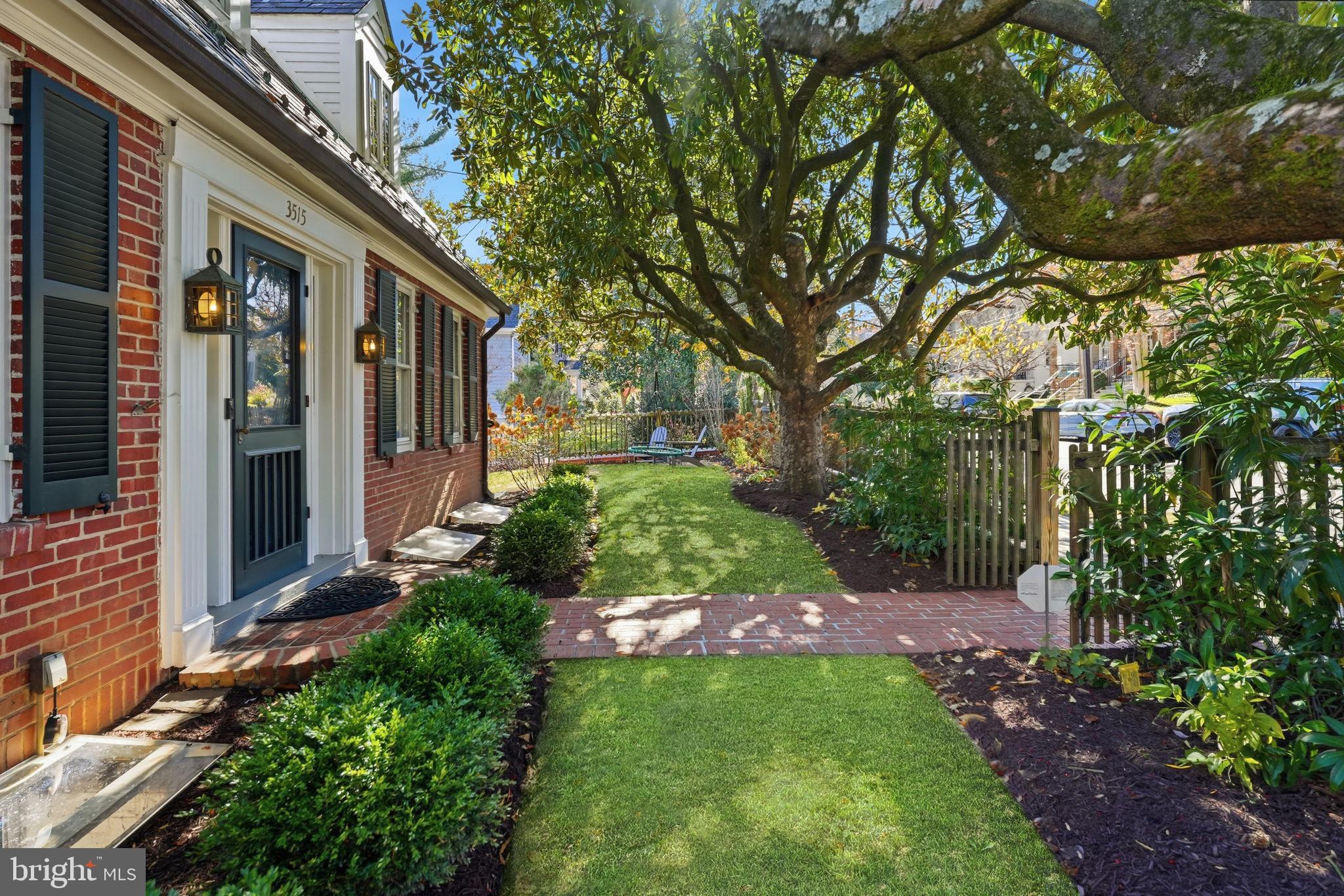 Picture-perfect, all-brick Yorktown Cape Cod that elegantly marries classic design with modern comforts. Nestled behind mature southern magnolias and mature landscaping on a quiet, dead-end block in Cleveland Park, 3515 36th Street greets you with a Vermont slate roof and central entry. Past the foyer, the grand proportioned living room features one of two fireplaces, while beyond glass French doors is a sun-filled separate dining area and adjacent breakfast bar kitchen with custom beadboard wood cabinetry, paneled Sub-Zero refrigerator & Miele dishwasher, and Heartland Legacy gas range. 3515 36th boasts four spacious bedrooms across three levels; primary (or guest) suite on the entry level with a wall of custom closets & built-in drawers, built-in shelving, and an attached, dual-entry marble bath. Upstairs, Bedroom 2 has recessed storage, dormer bookcases, windows on three exposures and ceiling fan, while opposite the hall is Bedroom 3 with dormer bookcases, ceiling fan, and closet. Full lower level features a spacious recreation room with beautiful birdseye maple wood floors, large FP, built in shelving, cabinets, storage, and recessed lighting. Also on the lower level is a large, open in-law suite (or optional Bedroom 4) with light maple wood floors and recessed lighting - and adjoins kitchenette with soft-close cabinets, U-Line refrigerator/freezer, and sink. En suite full bath features a tub/shower, vanity with storage, and window. On the exterior find a secluded flagstone circular patio in the back, another flagstone patio between the kitchen and garage/studio, and 2 rainwater barrels. The vaulted ceiling garage was converted into an artist studio (or office) with mini-split system A/C & baseboard heat for all-season enjoyment. 3 skylights and lights allow many uses for this space (and a pulley system allows a kayak, etc to be stored). Double doors swing open to also allow car-loading. Stone-paved off-alley parking for 2+ cars complements verdant landscaping.