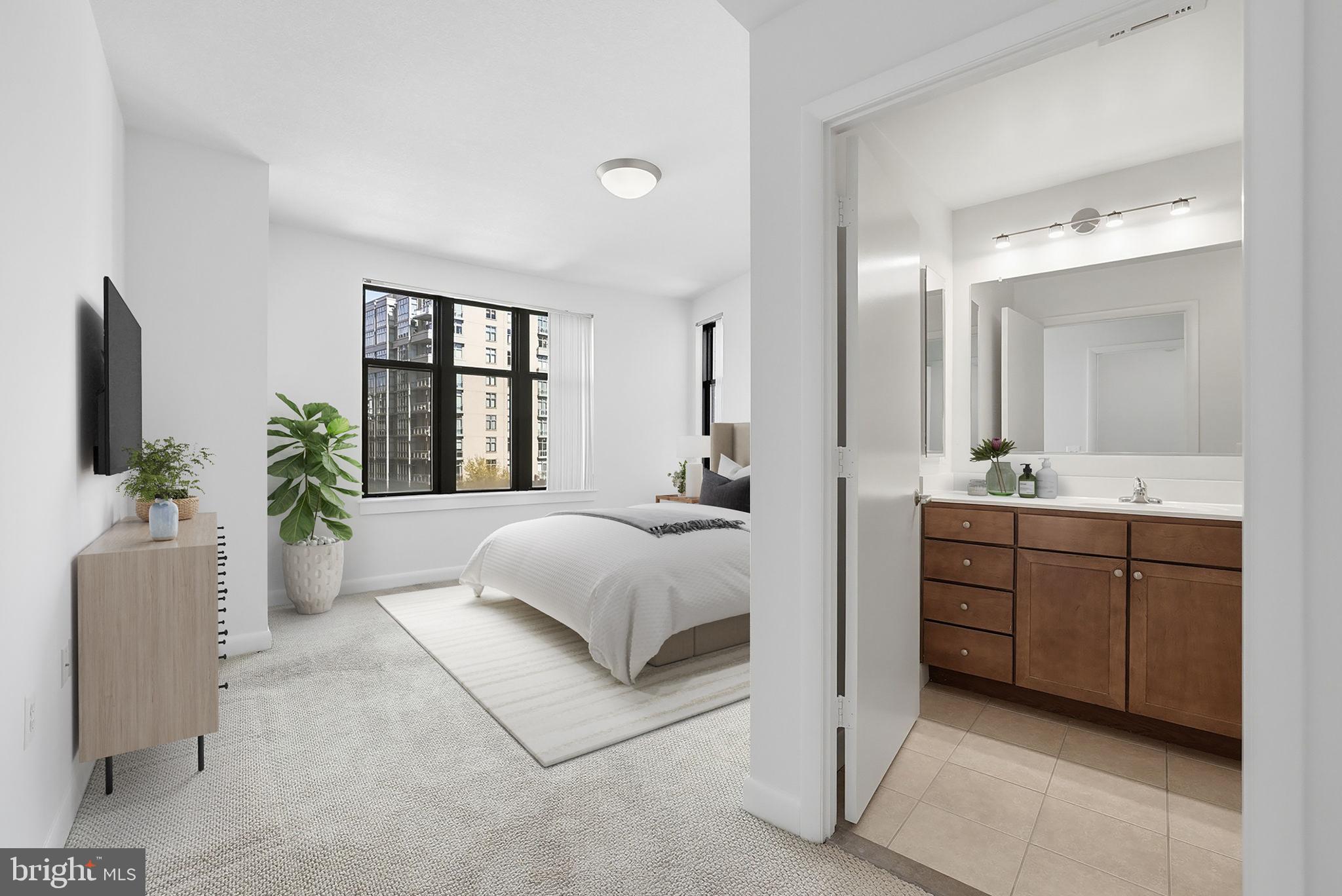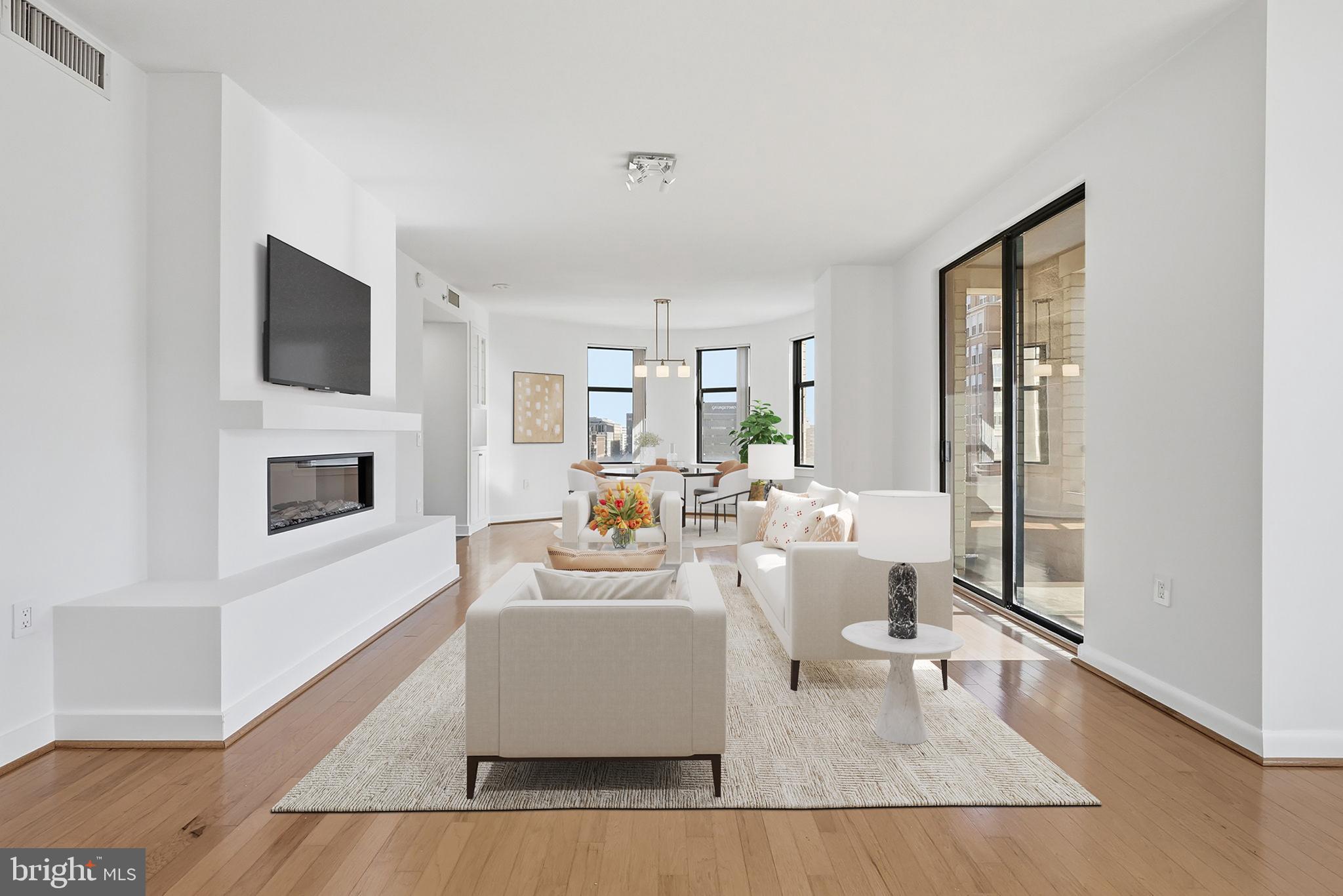 PRICE IMPROVED - WATCH THE SNOW BELOW from this unique offering! On the market for only the 2nd time & carefully maintained by its part-time owner, this generous (1,478SF!) gem offers large public rooms perfect for entertaining & daily living, as well as large bedrooms & appointed baths. #719's prominent corner position on a high floor offers 3 exposures flooding it with natural light & unparalleled views from every room. Inside, a quiet retreat awaits that the owner has meticulously and tastefully renovated, ensuring no detail overlooked. A wall of undulating windows opens to large living area that includes a FP & sliding door to its covered balcony. The modern kitchen has Cambria counters, stainless appliances, and custom cabinetry (including pull-out pantry) while its corner table space offers a perfect spot for morning coffee overlooking two exposures. The curved dining area, located at the bullnose of the building, has built-in lighted cabinet. Additionally, an in-unit washer & dryer and powder room facilitate easy living. The primary bedroom has an attached bath with dual vanity, a stall glass shower, a large closet & added linen closet space. 2nd bedroom is equally large and has two exposures filling the space with light & views. It also features an attached full bath with a soaking tub. Full-service 400 Mass offers 24/7 concierge, an updated gym, game room, reservable resident lounge, business center, and wonderful roofdeck with a barbecue area, lounge & dining alcoves, gardens, and pool. With its 2-car tandem PKG on the uppermost (closest to lobby) garage level & extra STORAGE, #719 offers everything needed for Downtown DC living at its finest.