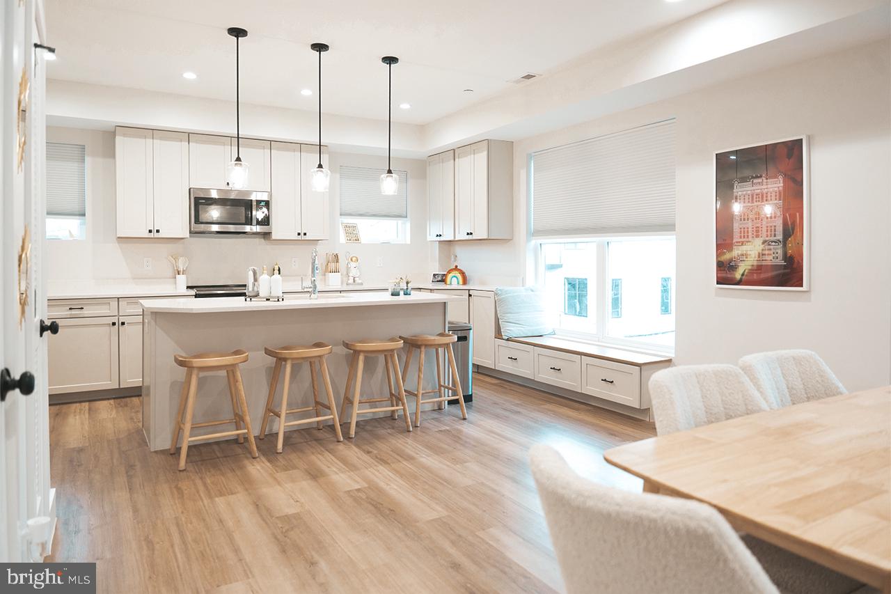 Inside, the home features 9 foot ceilings and hardwood flooring throughout, creating a bright and open layout. The kitchen is thoughtfully designed with quartz countertops, a large island, stainless steel appliances, and soft close cabinetry, flowing seamlessly into the main living space.
