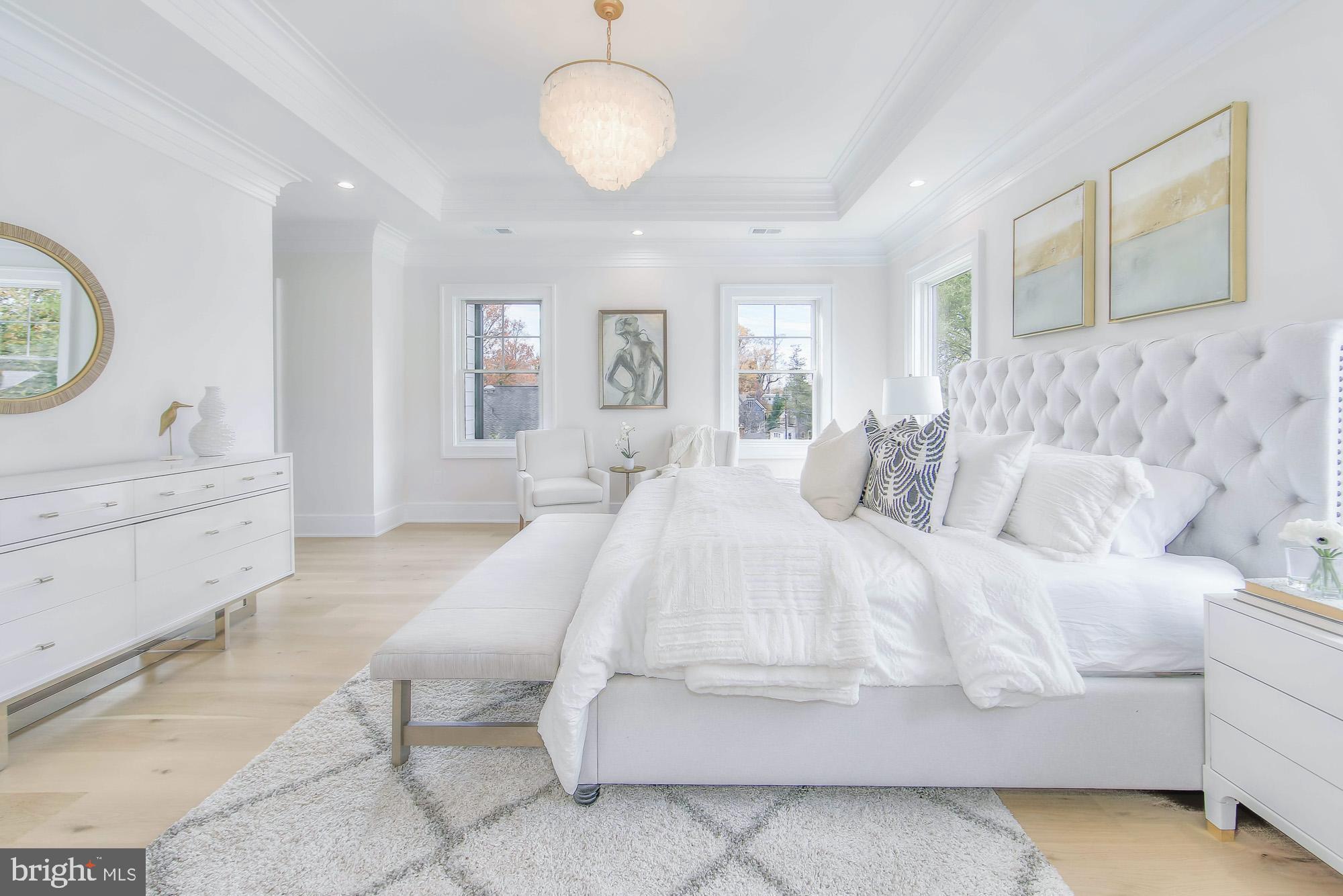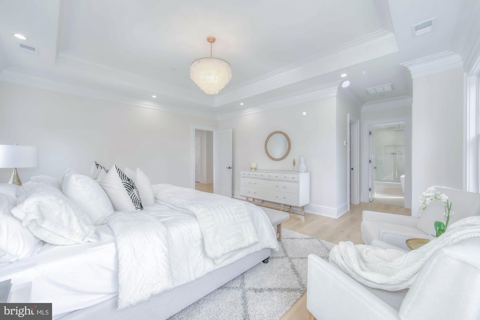 Upstairs, you'll find four bedrooms -- each with its own private ensuite bath. The primary suite is a true retreat, featuring a center chandelier, dual walk-in closets, and a spa-like bath with a glass shower and soaking tub. A private office and laundry room with folding space, sink, and shelving complete the upper level.